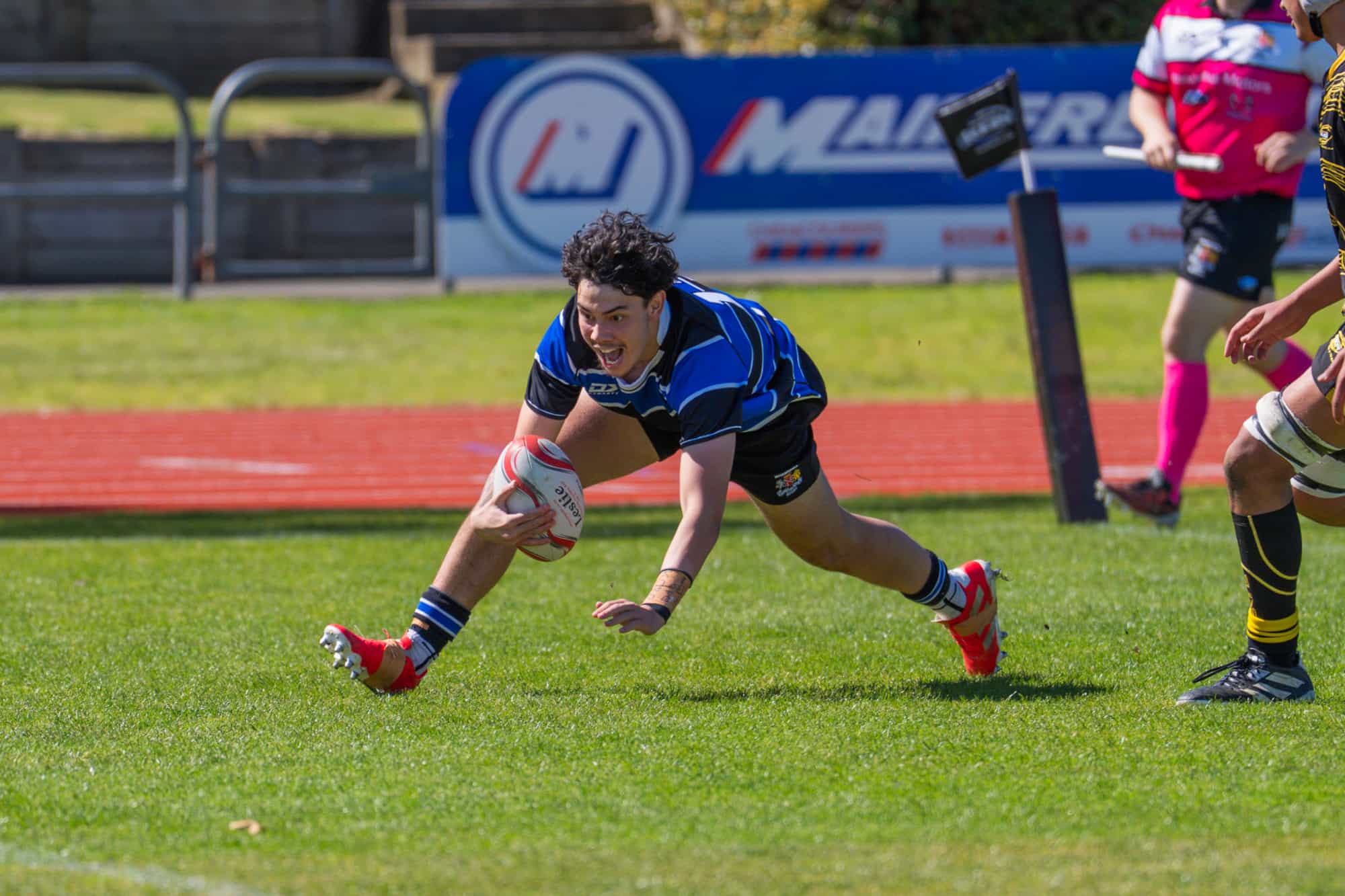 After the duelling hakas, Whanganui had a perfect start as second-five Johnathan Solomona combined with fullback Oliver Toohey in creating space for No8 Jahkobe Ahhoi to get to the corner flag and force the ball down through two tacklers, Toohey nailing the long range conversion.